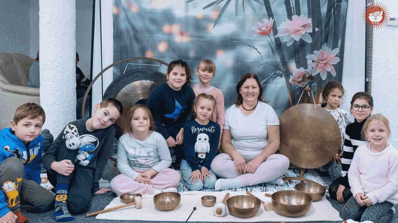 Hangterápiás foglalkozás ovisoknak, vagy 6–10 éves gyerekeknek a stressz oldására, a nyugalom megteremtésére és önbizalmuk erősítésére a mesék és a hangtálak világában.